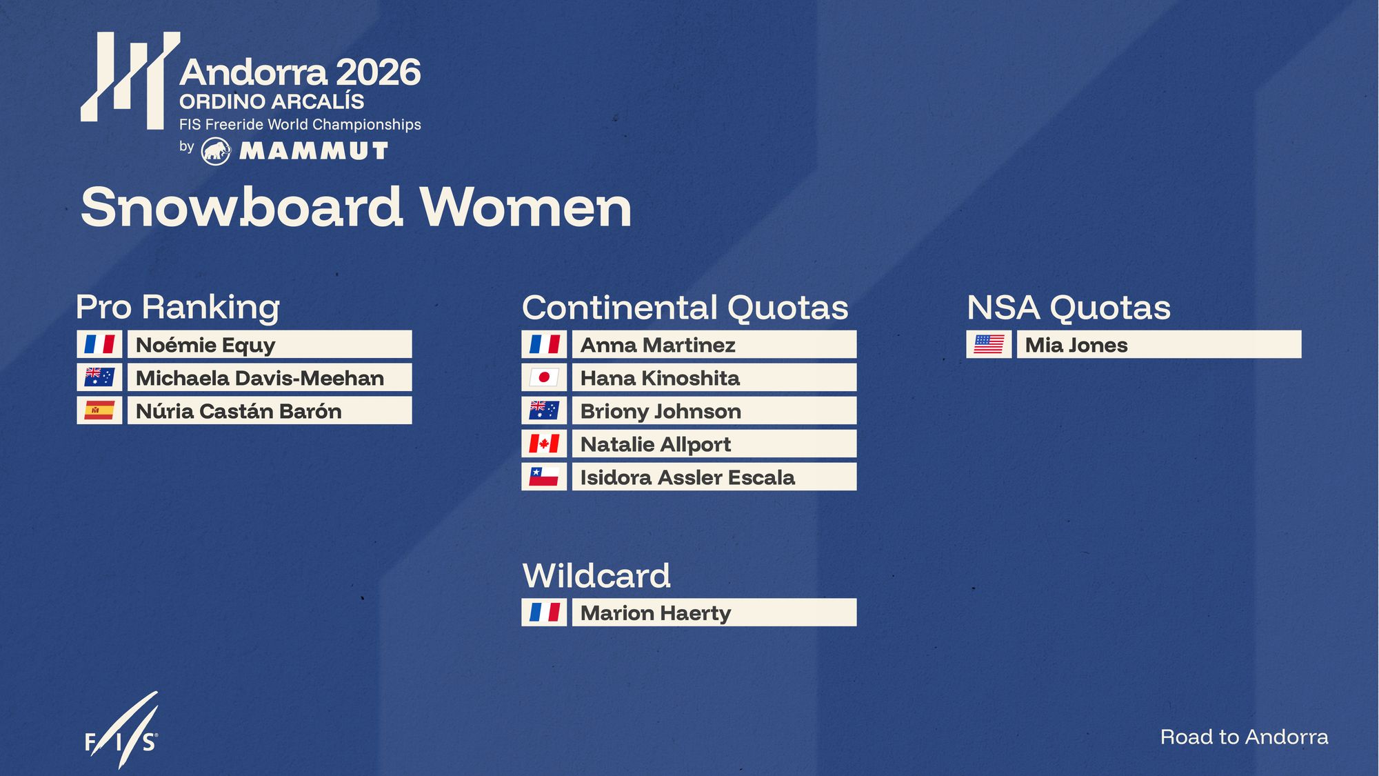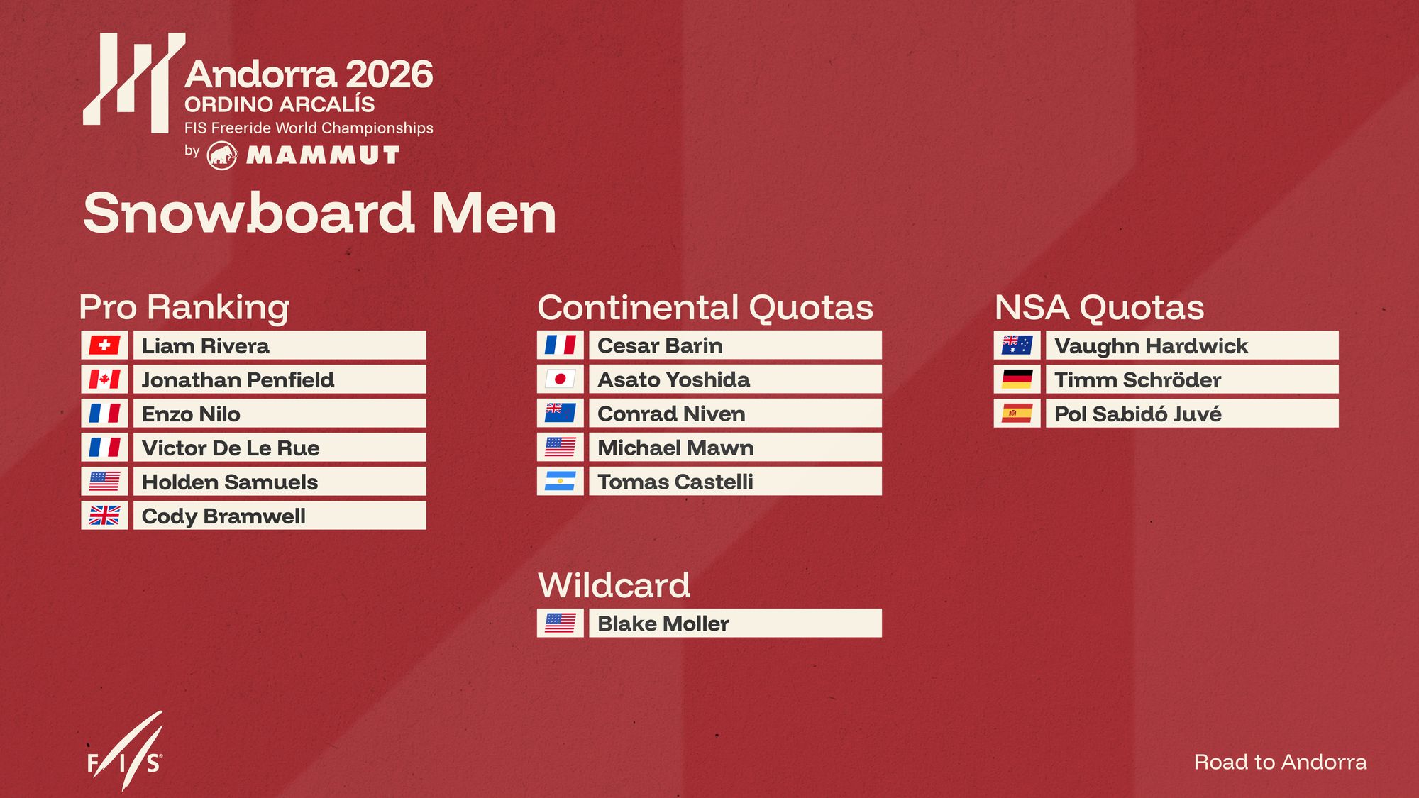 La última y 66.ª plaza para el rider se otorga mediante la Wildcard del país anfitrión, otorgada por la Federación Andorrana de Esquí (FAE). Esta selección final garantiza la representación del país anfitrión y completa oficialmente la lista.